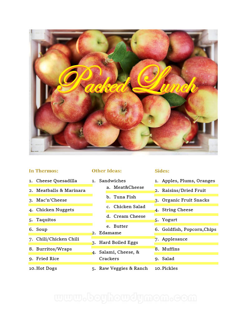 I find that meal planning de-stresses my day. The difficulty isn’t always in finding ideas – it’s in lunch ideas that work for your family. Most idea lists do not work for my people so I have to combine several and experiment on my children (mwa ha ha). I try to do a protein, carb, fruit/vegetable, and something sweet or salty to round it all out. Here is what has worked THIS year (and yes my kids love to decide they cannot eat something anymore if I serve it too much or just cuz… so good luck!):